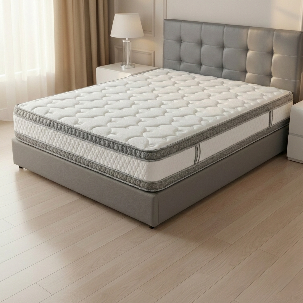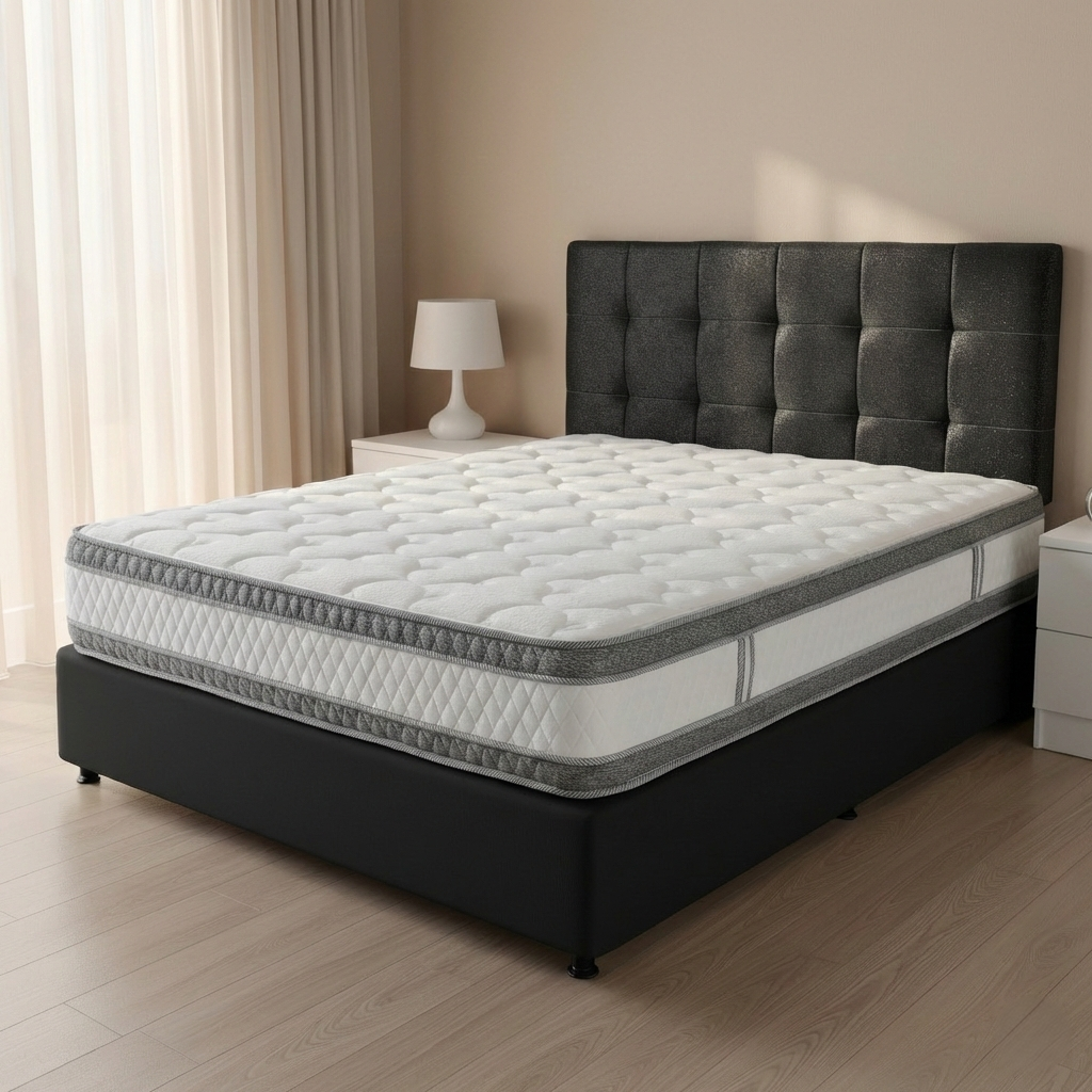 -Cama tapizada en tela jackard, con estructura interna en madera reforestada seca al horno.